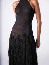 Black halter evening gown with sheer base and layered artisan fringes