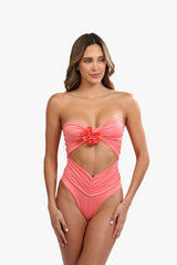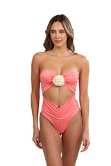 This stunning one-piece swimsuit in salmon color features a captivating floral detail on the front, which can be removed if desired. The ruched sides, bare back, and golden plated accents add a touch of elegance. The removable flower comes in the same color as the suit, and the strapless design showcases a beautiful silhouette. Made for women who want to make a statement at the beach or pool.