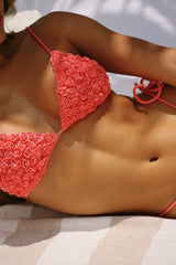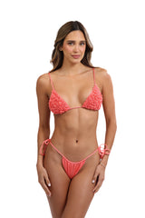 Introducing the BUBBLE TEA SWIM - a two-piece triangle swimsuit that will make you stand out at the beach! Featuring a vibrant Salmón color, elegant brass-type chargers, and delicate mini flower details. The bikini bottom has side ties for a perfect fit, and the top is adorned with a gold-plated badge. Get ready to make a statement, just like our model who wears a size S with measurements: hips 90cm, waist 64cm, bust 90cm.