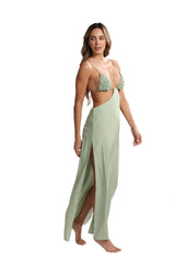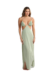 Experience effortless elegance with our Ginko long skirt. The flowy green fabric is complemented by side slits and a metal attachment for pairing with the matching top (sold separately). The waistband is adjustable, and the removable attachment adds versatility to your style. Embrace your inner goddess with this stunning skirt!