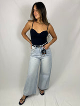 Introducing the Harper denim jeans, crafted with a wide cut and light wash for a trendy look. Features a removable belt mini purse for added convenience. Elevate your wardrobe with these stylish jeans.