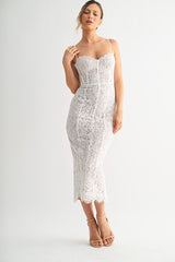 This stunning lace midi dress features a structured corset bodice with visible boning and scalloped lace trim along the neckline. The fitted silhouette hugs the figure before tapering to a delicate lace hem. Adjustable shoulder straps and a back zipper ensure a secure and comfortable fit. A back slit adds ease of movement while elevating the allure of this elegant piece. Fully lined.