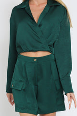 Elevate your style effortlessly with the Juliana Dark Green Silky Set. This chic combination features a long sleeve shirt top paired with high-waisted cargo shorts, blending comfort and sophistication. The silky fabric drapes smoothly, offering a luxurious feel while the high waist design flatters your silhouette. Perfect for both casual outings and stylish evenings, this set brings versatile elegance and a touch of modern edge to your wardrobe.