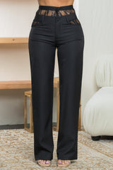 Elevate your wardrobe with the Contrast Lace Straight Leg Pants, designed to blend classic tailoring with a modern twist. These pants offer a flattering straight-leg fit that enhances your silhouette while the delicate lace accents add a touch of elegance and femininity. Perfect for both professional settings and evening outings, they provide comfort and style that transitions seamlessly throughout your day. Make a statement with every step in these uniquely sophisticated pants that combine versatility and standout detail effortlessly.