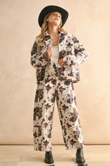 Embrace bold style with the Adriana Cow Barrel Pants, featuring a unique brown multi-printed cow pattern. These pants offer a comfortable barrel fit that moves with you, making them ideal for both casual outings and standout looks. Elevate your wardrobe with this eye-catching design that combines comfort and personality effortlessly.