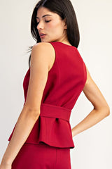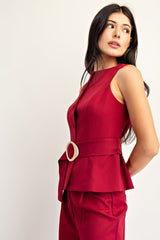This sophisticated sleeveless top features a sleek, tailored silhouette with a modern twist. Designed with a round neckline and vertical fabric-covered button details, it adds a touch of elegance to any ensemble. The standout feature is the wide waist belt with a bold, oversized round buckle, cinching the waist for a flattering, structured look. Finished with a layered peplum hem and clean back design, this top is perfect for work or chic occasions.