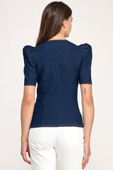Elevate your casual wardrobe with the Julie denim top, featuring a stylish metal button detail for a subtle edge. Its cap puffy sleeves add a feminine touch while ensuring comfortable wear throughout the day. This versatile denim shirt effortlessly blends classic design with modern flair, making it perfect for both relaxed outings and chic layering. Upgrade your look with the Julie denim top and enjoy timeless style and effortless confidence.
