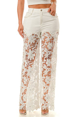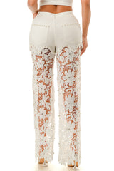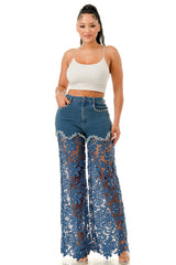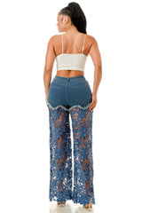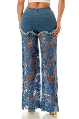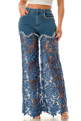 Make a bold fashion statement with Sele wide-leg denim pants, combining high-rise stretch denim with dramatic sheer floral lace legs adorned with full pearl accents. Pearl-trimmed pockets and waistline add a touch of elegance, while the invisible side zipper ensures a sleek fit. Available in Denim Blue and Ivory White, these pants are perfect for festivals, events, and standout street style looks. Embrace edgy sophistication and turn heads wherever you go.