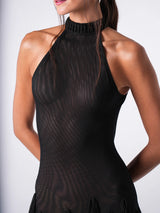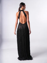 Black halter evening gown with sheer base and layered artisan fringes