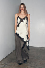 Elevate your evening wardrobe with the Paula Sofia Lace Dress. Crafted from smooth satin, this dress features a flattering V-neck and delicate thin straps for a graceful silhouette. Intricate lace appliqué adds a touch of romance, while the asymmetrical hem with a slit creates a captivating, dynamic look. Perfect for special occasions where elegance meets bold style.