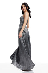 The Adrian Dress captivates with its shimmering metallic pleated plissé and a structured strapless sweetheart bodice that enhances your silhouette. Featuring boning for support and a flowing floor-length skirt lined for comfort, it promises effortless elegance. Adjustable removable straps and a secure back zipper ensure a perfect fit, making this dress ideal for making unforgettable entrances.