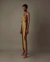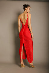 The Bless Solé Long Dress features a flattering deep V-neckline and a subtle back slit that effortlessly sculpts your silhouette. Designed with a center-back zipper and a built-in stretch lycra bodysuit, it ensures both comfort and freedom of movement. Hand-sewn strands mimic the flowing movement of water, adding a touch of elegance and sensuality. Perfect for any occasion, this dress combines comfort and style to make you stand out with graceful confidence.