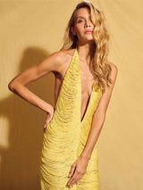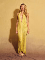 This breathtaking halter dress features a deep plunging neckline that elongates your torso and accentuates your natural curves. Hand-dyed with care, it showcases cascading fringes that wrap elegantly around the neck, creating a vertical flow that enhances both height and movement. Each dress is uniquely finished with subtle color variations, highlighting its artisanal charm. Embrace a bold yet refined silhouette that effortlessly captures confidence and feminine allure.