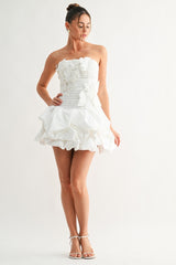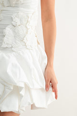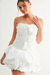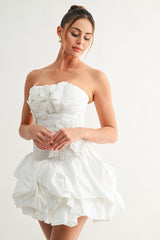 The Bloom Sculpted Mini Dress is a statement piece designed for those who refuse to blend in. Its strapless neckline frames the shoulders beautifully while textured 3D floral appliqués create dimensional artistry across the bodice. The structured silhouette flatters your figure, while smocking at the back ensures all-day comfort without sacrificing style. A voluminous bubble hem delivers playful movement and drama, and the hidden zipper makes getting ready effortless. Whether you're walking down the aisle, commanding attention at a gala, or turning heads at an upscale celebration, this dress transforms any occasion into a moment worth remembering.