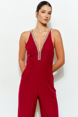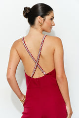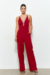 Make a statement in this Crystal Trim Deep V Cross Back Jumpsuit, where sophisticated design meets modern elegance. The crystal-embellished straps frame a striking deep V-neckline while the innovative cross-back silhouette creates visual intrigue. A sleek tailored bodice flows into flattering wide legs, and hidden side pockets offer practical style. The invisible back zipper ensures a seamless finish. Whether you're attending an evening gala, holiday celebration, or milestone event, this jumpsuit delivers the polished, head-turning look you deserve.