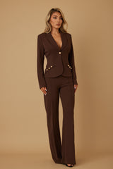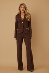 Elevate your wardrobe with this stunning two-piece outerwear set that combines timeless sophistication with modern flair. The tailored blazer features eye-catching gold bell buttons and functional side pocket flaps, delivering both style and practicality. Paired with sleek solid flare pants complete with a convenient back waist zipper, this set creates an effortlessly polished look for any occasion. Crafted from a comfortable 95% polyester and 5% spandex blend, the fabric offers flexibility and durability. Perfect for dressing up or down, this imported set is your go-to choice for making a confident statement.