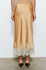 Elevate your wardrobe with the MariG Satin Lace Skirt, featuring a graceful maxi length and delicate lace trim at the hem. Its smooth satin fabric drapes beautifully, adding a touch of elegance to any outfit. Perfect for both special occasions and stylish everyday wear, this skirt blends comfort with sophistication effortlessly. Embrace a look that turns heads and feels luxurious all day long.