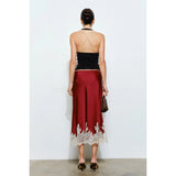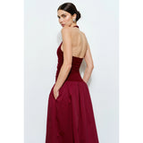 Experience effortless elegance with the Odette Ruched Halter Maxi Dress. Featuring a soft, ruched halter bodice paired with a voluminous woven cotton skirt, it combines texture and style beautifully. The dropped waist enhances a sleek, modern silhouette, while the open back adds a touch of allure. Crafted with a comfortable blend of polyester, spandex, and cotton, this dress offers both stretch and breathability, perfect for making a striking impression at any occasion.