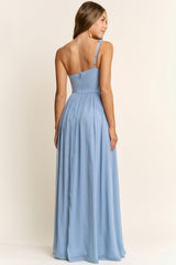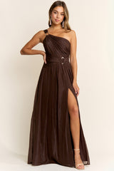 Make a statement at your next event in this stunning one-shoulder slit maxi dress. Crafted from luxurious shiny fabric that catches the light beautifully, this dress features an elegant metal ring detail and a daring thigh-high slit for modern sophistication. Perfect for bridesmaids or wedding guests seeking a show-stopping look that balances glamour with contemporary style. The asymmetrical neckline and flowing silhouette create an effortlessly chic appearance that works for any formal occasion.