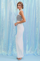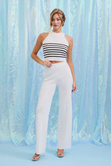 Elevate your vacation wardrobe with the Rebecca Stripe knit set. Crafted in luxuriously soft white and black knit, this sleeveless mock neck top and pant set exudes sophistication. Perfect for a stylish and effortless look, it's the ideal choice for your next getaway.
