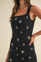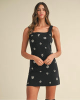 A playful yet elegant mini dress featuring a fitted silhouette with scattered floral embellishments. The square neckline and sleeveless design add a modern edge, while the sparkling details give it a whimsical and sophisticated charm, perfect for evening outings or special occasions.