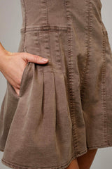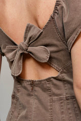 This stretch denim romper combines comfort and style with its flattering sweetheart neckline and playful ruffle sleeves. Pleated details at the hips enhance its shape, while the tie-back design offers an adjustable, personalized fit. Crafted from a soft blend of cotton, polyester, and spandex, it moves with you for all-day ease. Perfect for effortless chic on warm days.