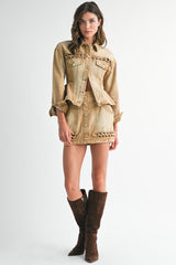 Elevate your denim collection with this standout mini skirt that combines classic style with modern edge. The front button-down closure and five-button design deliver authentic vintage charm, while belt loops ensure a perfectly tailored fit. Braided detailing at the hem adds an unexpected textural element that sets this piece apart. The faded wash brings effortless cool-girl appeal, and the convenient back zipper makes dressing a breeze. Versatile enough for casual days or dressed-up nights, this skirt is the wardrobe essential you've been waiting for.