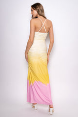 The Catalina maxi dress combines elegance with modern sophistication. Featuring a striking cowl squared neckline and form-fitting silhouette, this piece flatters your figure while the ruched torso adds dimension and visual interest. A dramatic waterfall flap in front creates movement and intrigue, while the ombre color gradient brings depth and contemporary style. Perfect for evening events or upscale occasions, this maxi length dress makes a confident statement that turns heads.
