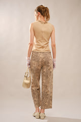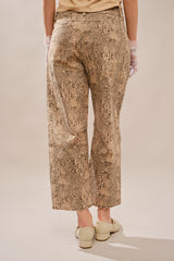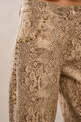 Elevate your everyday style with these high-rise barrel leg pants that blend comfort with contemporary flair. The allover snake print adds visual intrigue, while antique gold studs accent the pockets and side seams for a touch of sophistication. Crafted from a breathable cotton-spandex blend, these pants offer the perfect balance of structure and stretch. The relaxed cropped silhouette skims the leg without clinging, creating a flattering silhouette that works from day to night. Whether you're dressing up or keeping it casual, these statement pants are the versatile piece your wardrobe has been waiting for.