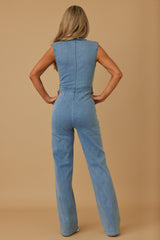 Make a statement in the Vanessa Denim Stud Jumpsuit, a versatile one-piece that effortlessly transitions from day to night. Featuring open sleeves and a sleek vest jumpsuit silhouette, this piece combines edgy style with modern sophistication. The single button-up front and back zipper closure offer easy styling options, while decorative studs add an eye-catching detail. Crafted from a comfortable blend of 76% rayon, 22% polyester, and 2% spandex, this imported jumpsuit drapes beautifully and moves with you. Hand wash cold, do not bleach, and air dry flat to maintain its quality. Model is 5'8" and wearing a size small.